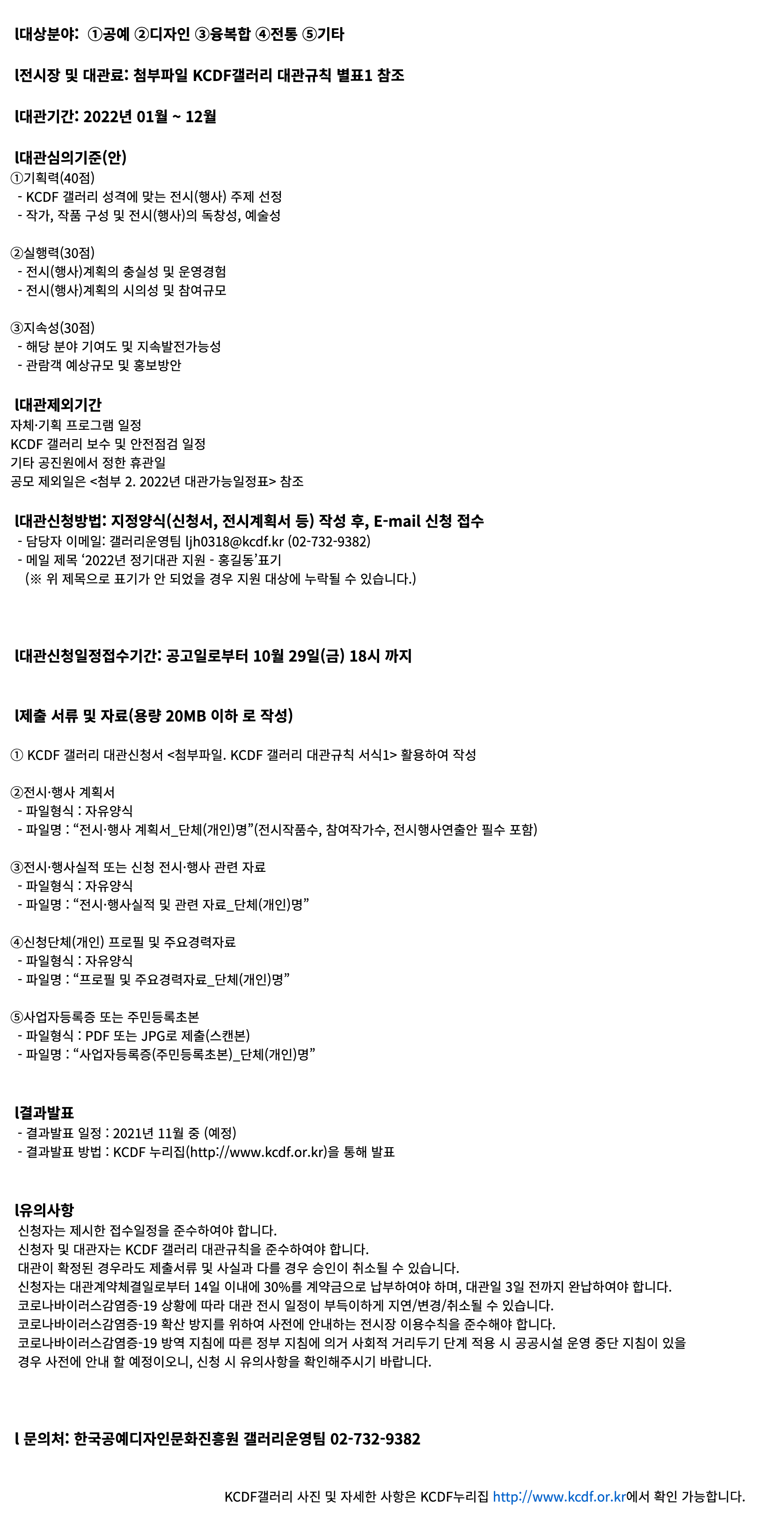 2022년 한국공예디자인문화진흥원 KCDF갤러리 정기대관 공모를 다음과 같이 안내하오니 많은 관심과 참여를 바랍니다.