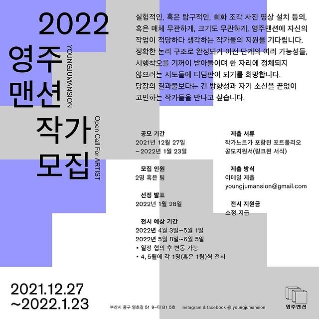 | 문의| | 페이스북, 인스타dm, "영주맨션“ 혹은 이메일 youngjumansion@gmail.com |
