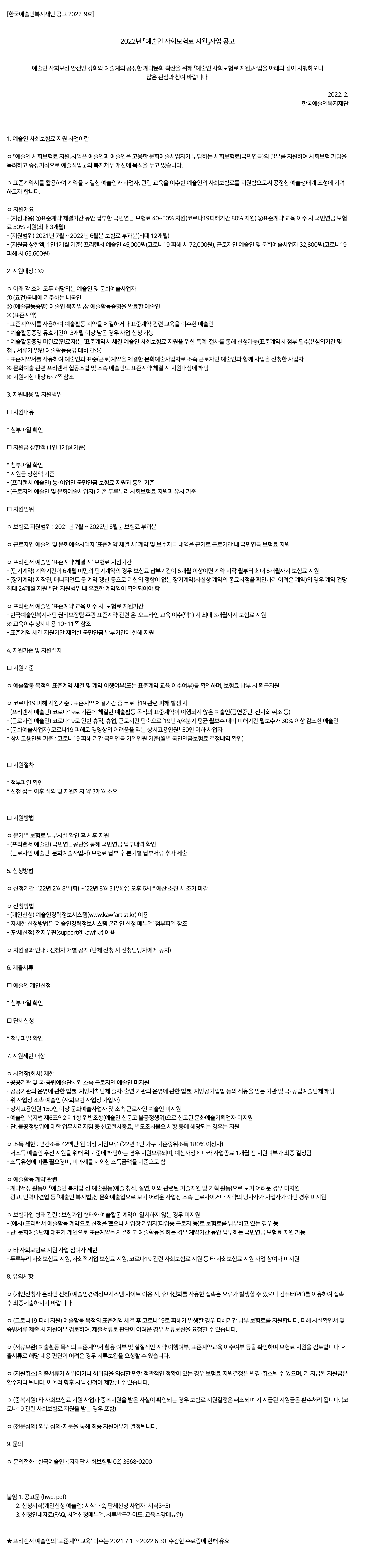 문의| 한국예술인복지재단 사회보험팀 02) 3668-0200