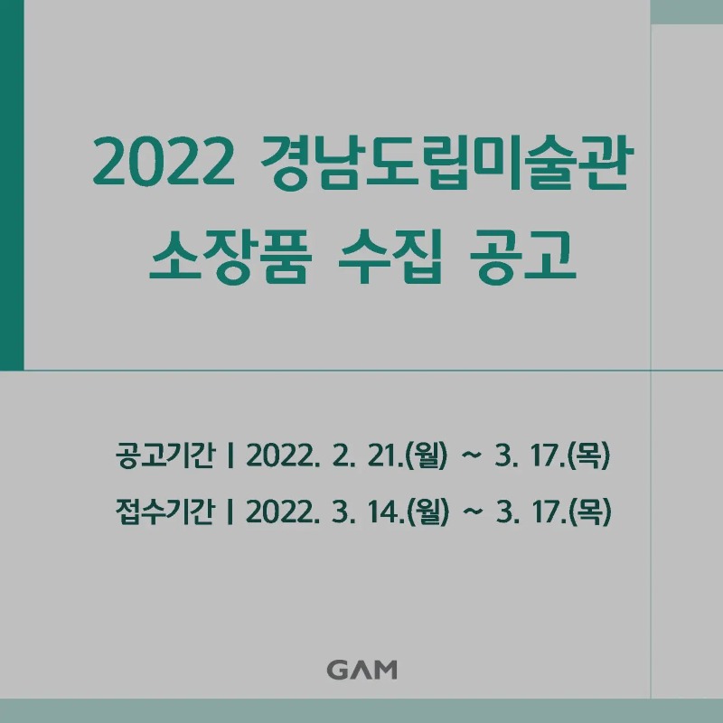 경남도립미술관은 2022년도 소장품 수집에 관한 내용을 다음과 같이 공고하오니, 작가, 화랑, 개인 소장가, 법인 등의 많은 참여를 바랍니다.
