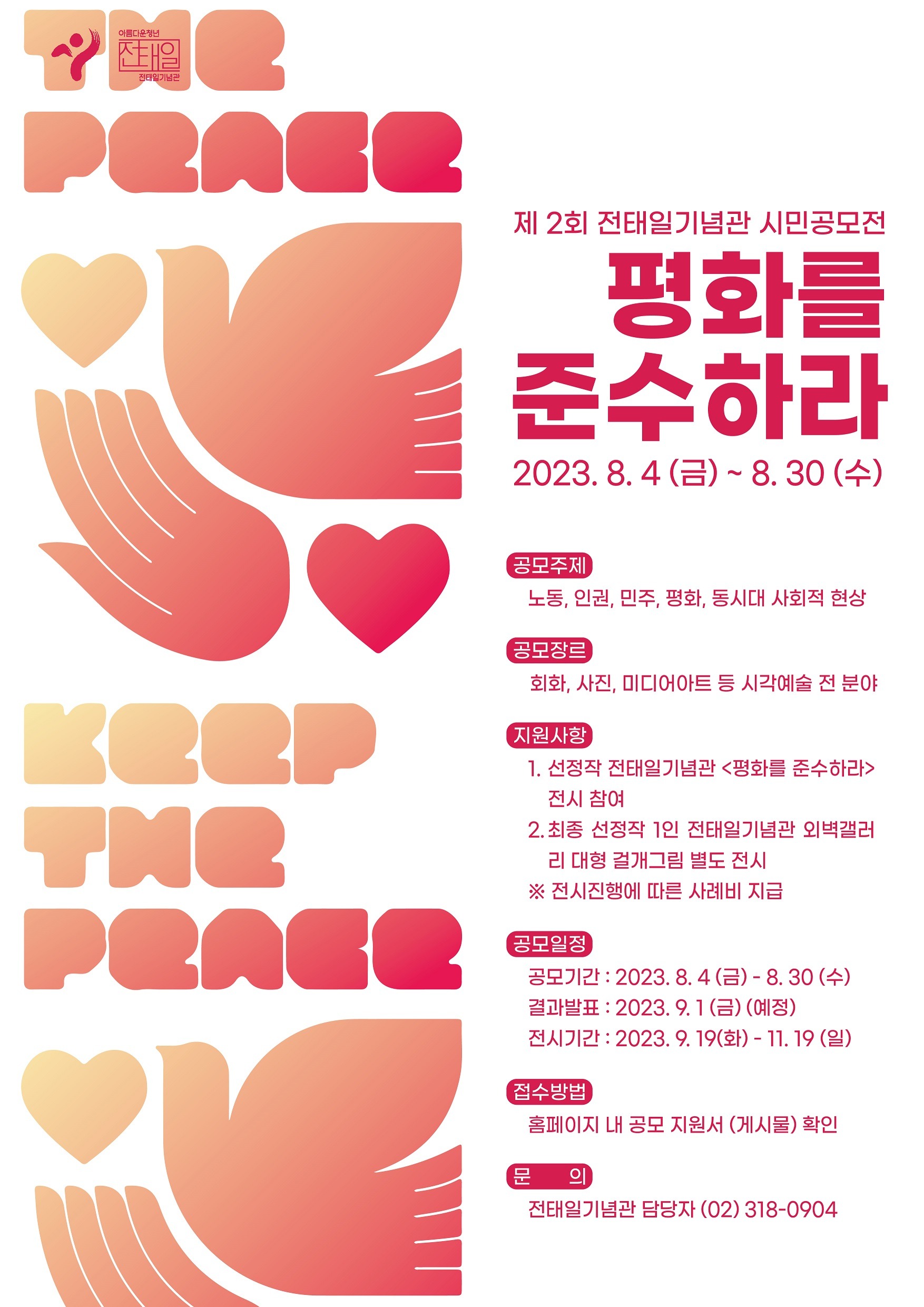전태일기념관에서는 제2회 <평화를 준수하라> 공모를 시행합니다. 전태일기념관과 관련 주제에 관심을 갖고 계신 시민여러분의 많은 참여 바랍니다.