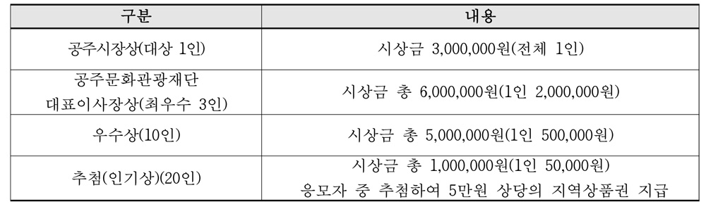 ※ 시상금은 공모전 출품작에 대한 법정 도시 기간 내 공주 문화도시 홍보로 활용하기 위한 아이디어 사용료임.
