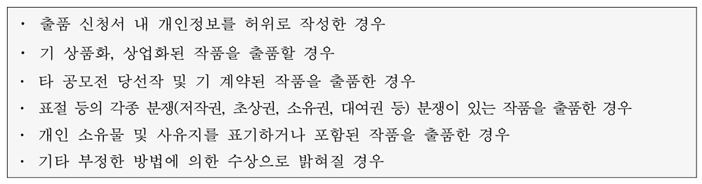 ◦ 다음에 해당하는 사항은 선정 대상에서 제외 및 취소, 시상금(지적재산권에 대한 이용료)은 환수될 수 있음