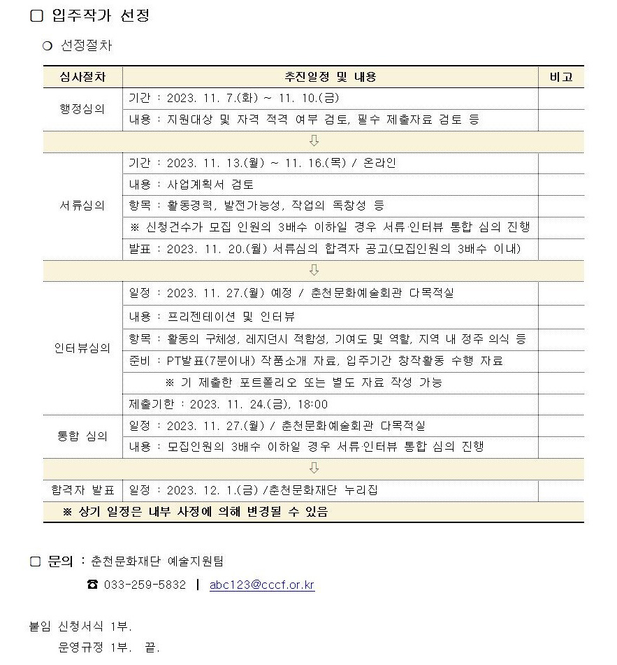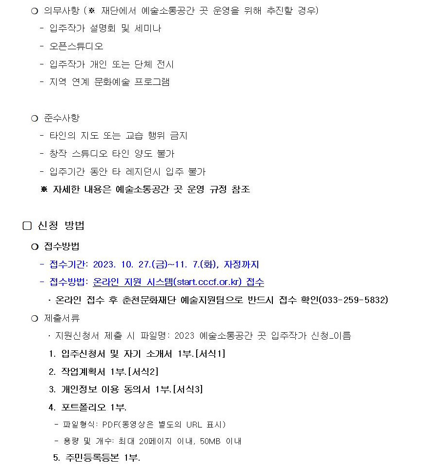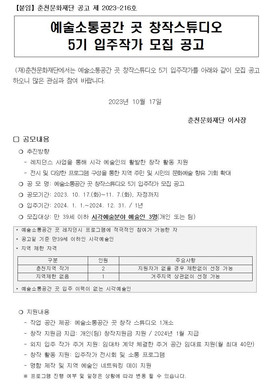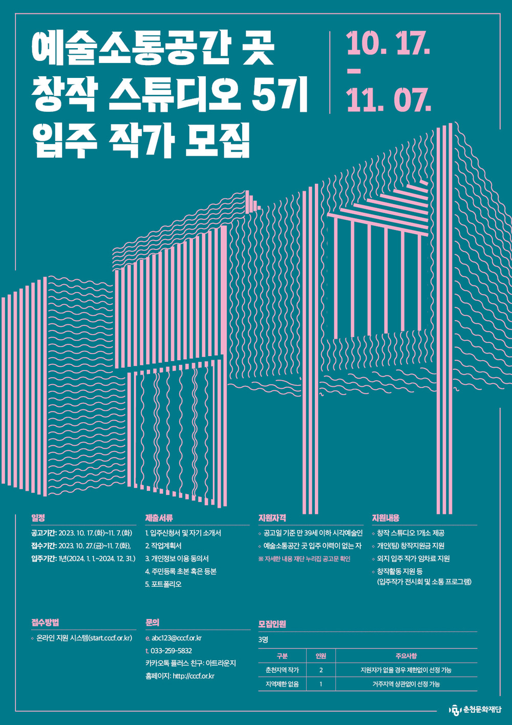 춘천문화재단 예술소통공간 곳 창작스튜디오 5기 입주작가 모집 공고
