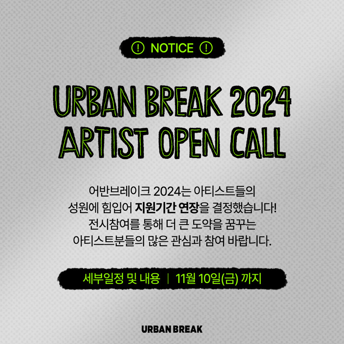 어반브레이크 2024는 아티스트의 성원에 힘입어 지원기간 연장을 결정했습니다! 전시참여를 통해 더 큰 도약을 꿈꾸는 아티스트분들의 관심과 참여 바랍니다.
