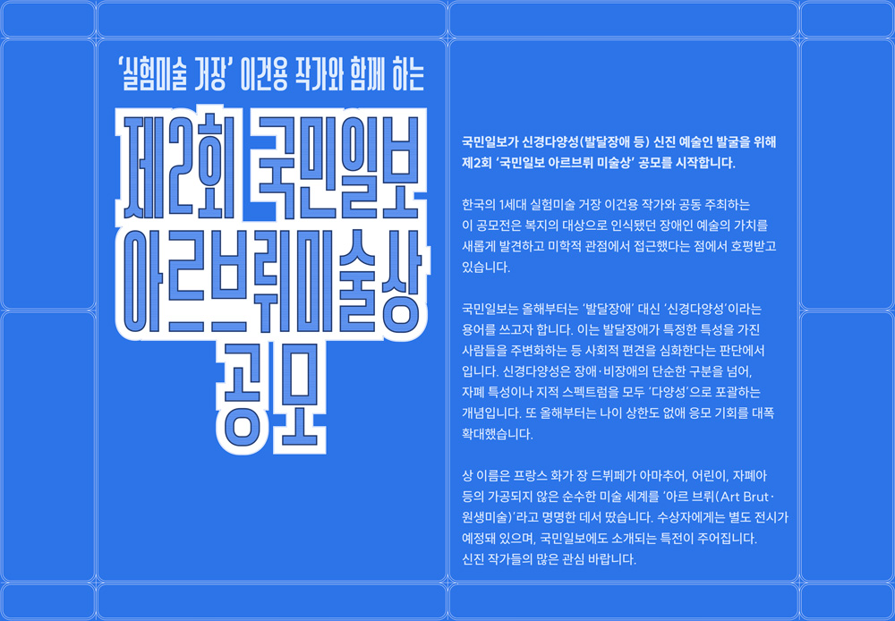국민일보가 신경다양성(발달장애 등) 신진 예술인 발굴을 위해 제2회 ‘국민일보 아르브뤼 미술상’ 공모를 시작합니다. 한국의 1세대 실험미술 거장 이건용 작가와 공동 주최하는 이 공모전은 복지의 대상으로 인식됐던 장애인 예술의 가치를 새롭게 발견하고 미학적 관점에서 접근했다는 점에서 호평받고 있습니다.
