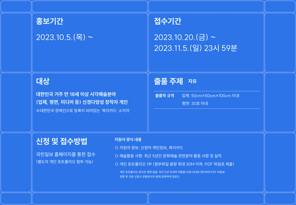 대한민국 거주 만 18세 이상 시각예술분야(입체, 평면, 미디어 등) 신경다양성 창작자 개인 ※대한민국 장애인으로 등록이 되어있는 ‘복지카드’ 소지자