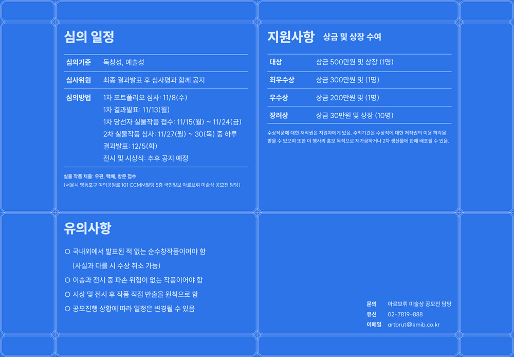 (서울시 영등포구 여의공원로 101 CCMM빌딩 5층 국민일보 아르브뤼 미술상 공모전 담당)