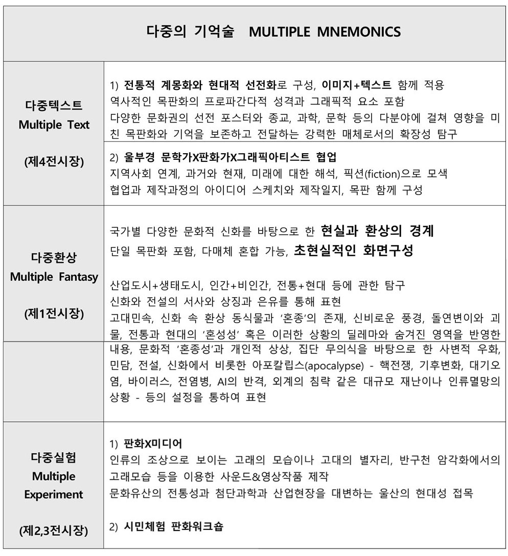 특히, 올해는 ‘다중의 기억술’이라는 메인 테마 아래, 3가지 소주제 - 다중텍스트, 다중환상, 다중실험 - 를 두고 판화적 특수성인 ‘다중’에 대한 사고를 역사적 사건과 문화적 서사, 혹은 개인적인 이야기를 인간과 비인간, 개인과 집단의 기억을 통해서 해석하고자 합니다.