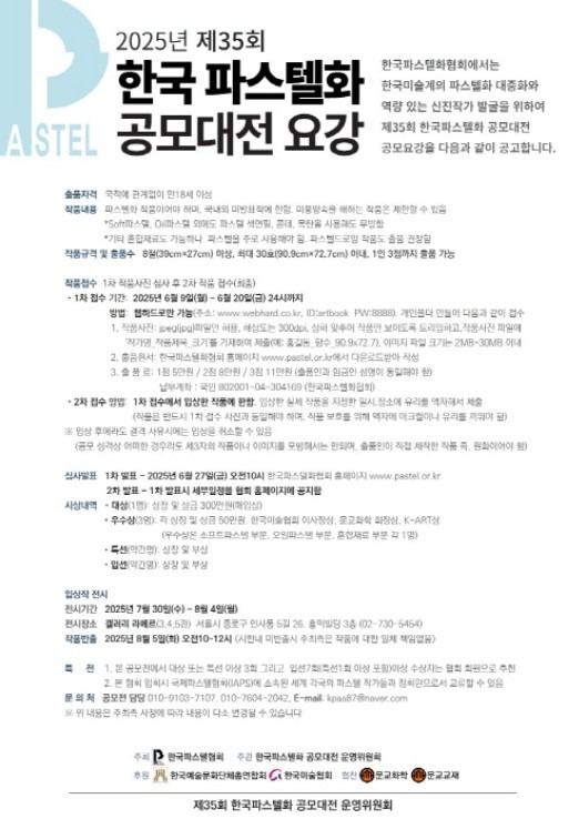 한국파스텔화협회에서는 한국미술계의 파스텔화 대중화와 역량 있는 신진작가 발굴을 위하여 제35회 한국파스텔화공모대전 공모요강을 다음과 같이 공고 합니다.