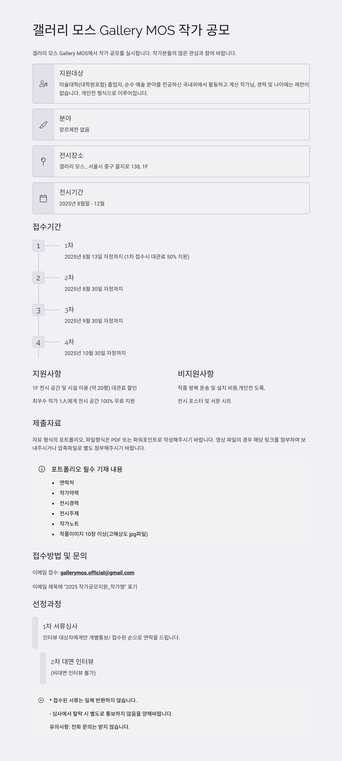 이메일 접수: gallerymos.official@gmail.com, 이메일 제목에 “2025 작가공모지원_작가명” 표기