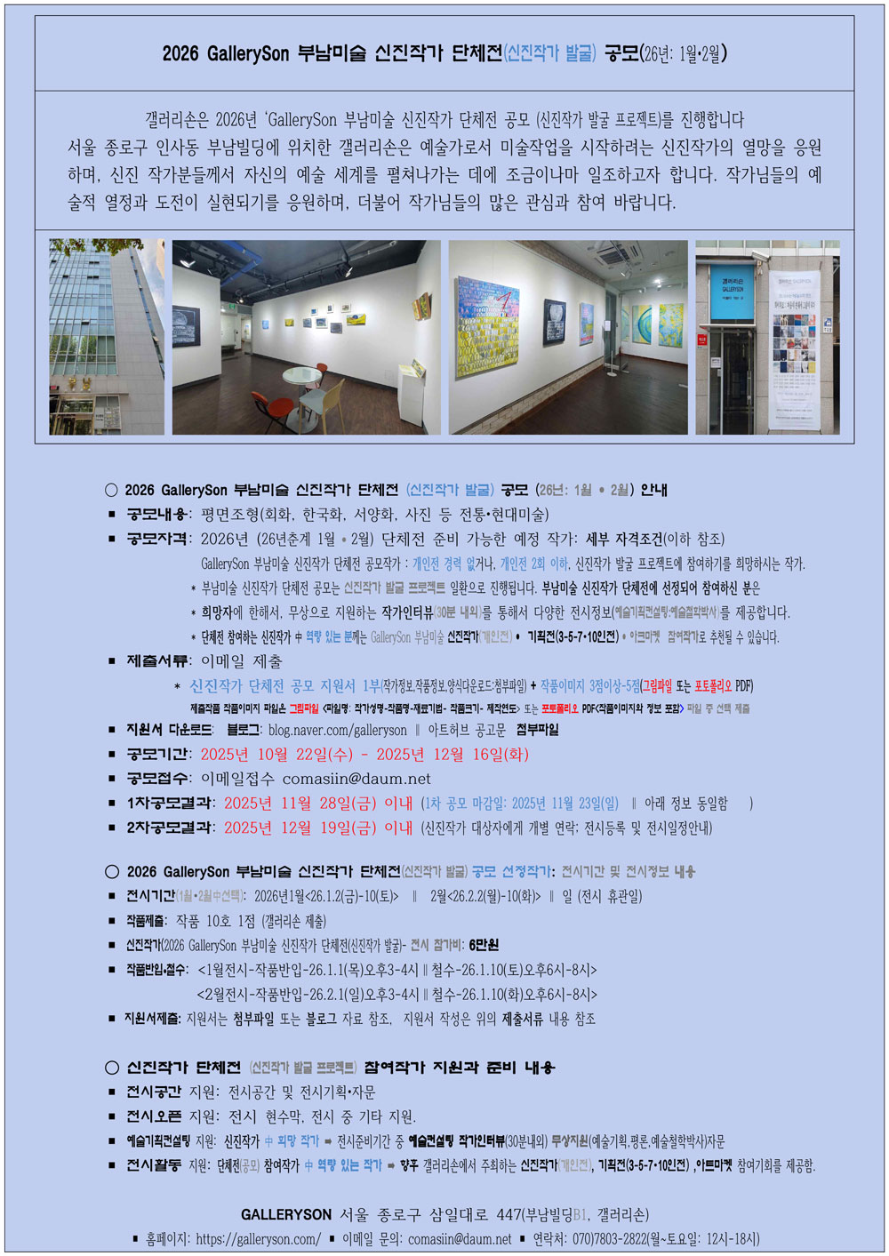 ▪ 신진작가(2026 GallerySon 부남미술 신진작가 단체전(신진작가 발굴)- 전시 참가비: 6만원