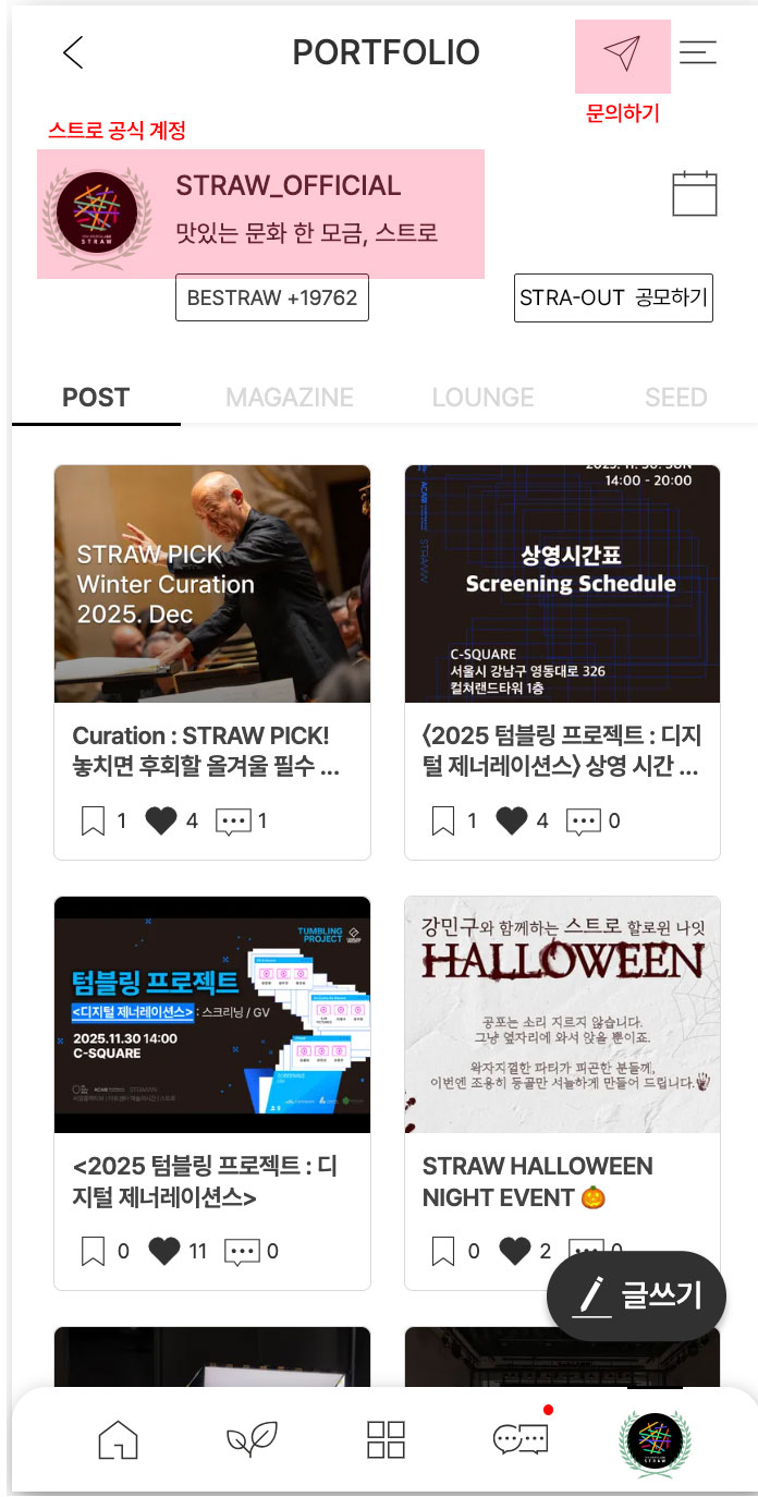 스트로 플랫폼 공식 계정(STRAW_OFFICIAL) Message 로 문의