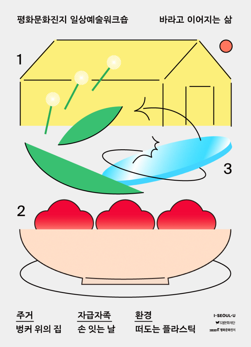 세상에 삶의 형태는 너무나 다양하고, 우리는 무언의 흐름에 따라 세상을 이어가고 있습니다. 일상예술워크숍 “바라고 이어지는 삶”은 주거와, 자급자족의 삶, 그리고 우리가 바라본 지구환경에 대해 이야기를 나눕니다.