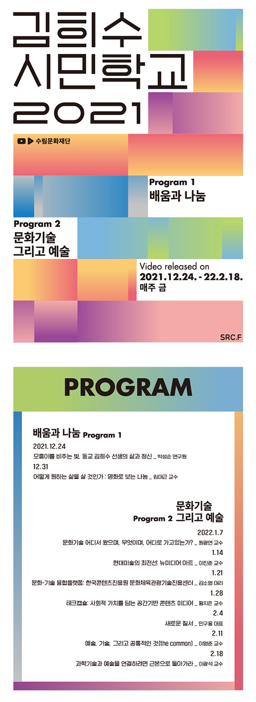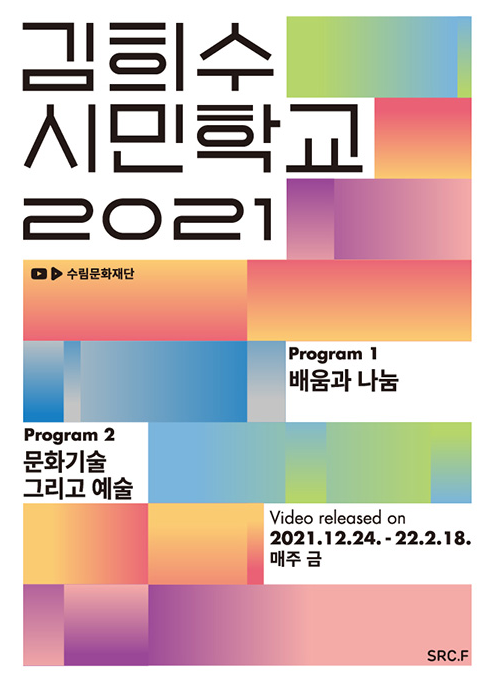 올해 <김희수시민학교 2021>은 설립자 철학을 바탕으로 한 <배움과 나눔> 그리고 동시대의 화두 중 하나인 문화기술과 예술의 융합적 가치를 살펴보는