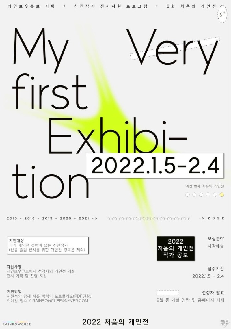 레인보우큐브에서는 2022년도 ‘처음의 개인전’을 진행합니다. 여섯 번째를 맞이하는 ‘처음의 개인전’은 자신만의 창작을 이어 나아가고 있는 시각예술가의 첫 개인전을 기획 지원합니다. 선정자는 합정동에 위치한 전시공간 레인보우큐브에서의 개인전 기회를 제공하며 이를 위한 전시기획과 진행 등 전시 전반의 과정에서 기획자가 함께 도움을 드리고 있습니다. 전시의 경험은 작가로서 한 단계 성장하는 기회가 될 것이라 생각합니다.